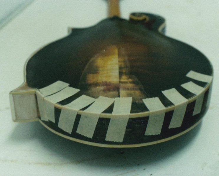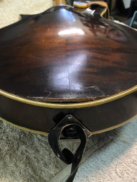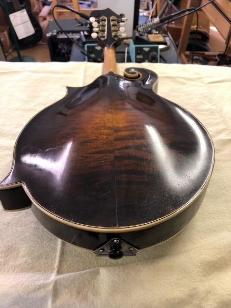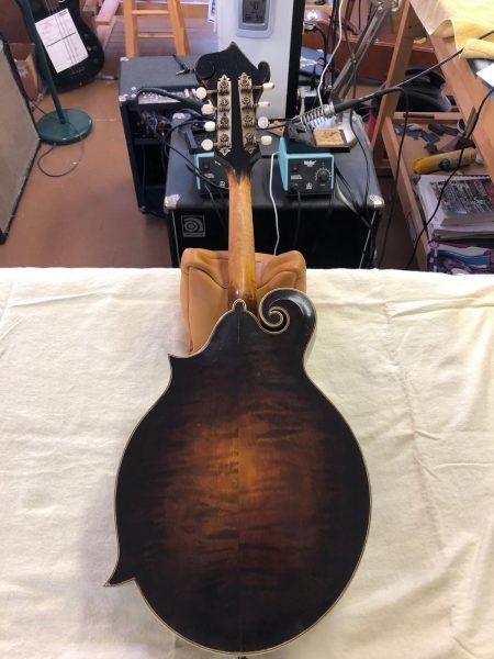 As reported by Gilchrist Mandolins & Guitars, this Gibson Master-Model F-5 Mandolin was found in the mid 90’s “wrapped in plastic, in its case and stored outdoors for years”. Identified by its factory order number (11965) the life of this F-5 started in 1923 at the original Gibson factory in Kalamazoo, MI. All wood pieces (Top, Back, Sides, & Tone Bars, F Holes) were carefully handcrafted by Gibson’s luthiers under the watchful eye of Loar. Each piece was then tap-tuned by Loar and paired with pieces that would produce a perfectly harmonious frequency. Loar adapted Stadivarius’ technique of “Plate-tuning” (tap-tuning) each piece in perfect harmony, ultimately providing an instrument with more volume and better freq. balance. Today(2019) tap-tuning plays a major role in acoustic guitar manufacturing. Without the creation of Loars Master Model Series instruments, more specifically the F-5 Mandolin (& L-5 Guitar), todays “Sound-Box” instruments might have a different voice. Of the (311) F-5 mandolins that have passed through the hands of Loar in his first floor laboratory at 225 Parsons st. this mandolin is (1) of (247) recorded by Daryl Wolfe (Wolfes F5 Journal).