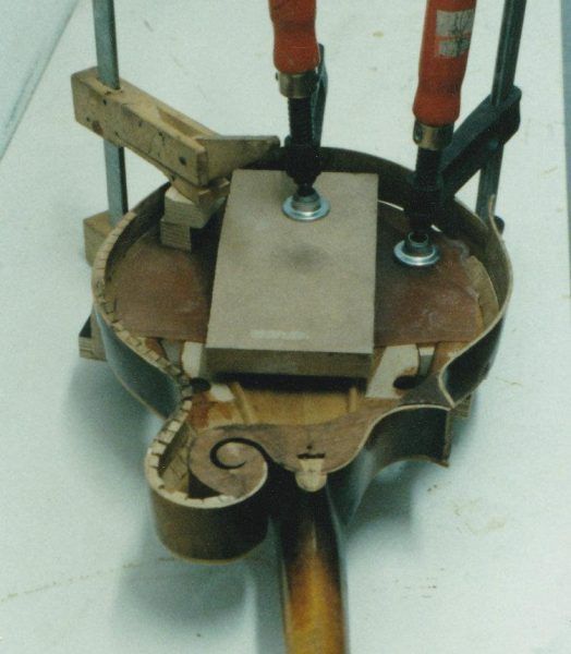 First step in repairing the bonding issues, was designing a custom jig and clamping system for securing areas needing bonding with an even amount of tension Then after cleaning and prepping each interior area Master Luthier Sutcliffe applied protocol specific adhesive from inside the instrument while monitoring his progress via borescope. As soon as the curing process was completed it was on to the fingerboard.